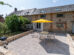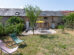 Cour devant la maison et terrasse et jardin derrière la maison.